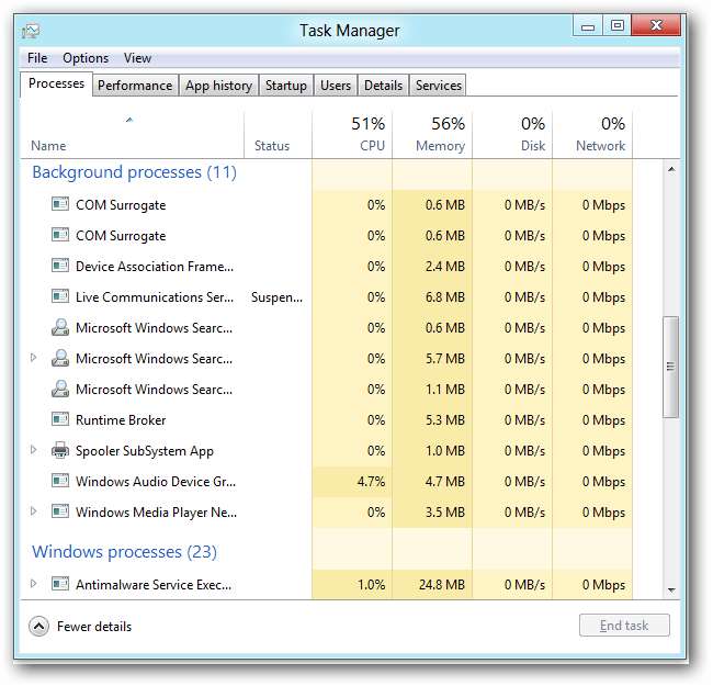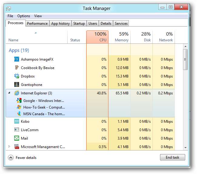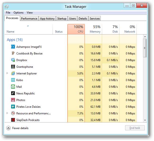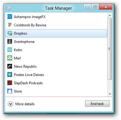 タスクマネージャのデフォルトのインターフェースを使用すると、煩雑な作業を邪魔することなく、アクティブなアプリケーションを簡単に表示して終了できます。 Metroスタイルのアプリとデスクトップアプリの両方が表示されます。