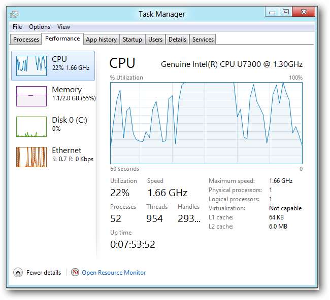 [パフォーマンス]タブには、システム情報の滑らかなグラフが表示されます。詳細については、右側のいずれかのオプションを選択してください。新しいインターフェイスには、古いタスクマネージャーよりもはるかに多くの情報が表示されます。