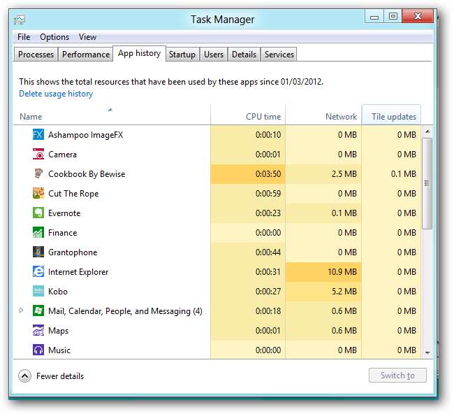[プロセス]タブには、各プロセスの現在のリソース使用量のみが表示されます。 [アプリの履歴]タブには、各Metroアプリが使用したCPU時間とネットワーク帯域幅が表示されるため、リソースの占有を特定できます。