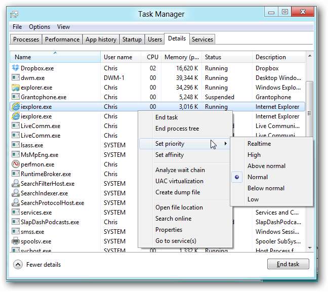 [詳細]タブは、以前のバージョンのWindowsの古い[プロセス]タブを進化させたものです。アプリケーションアイコンが追加されていますが、きれいなインターフェイスはありません。プロセスの優先度やCPUアフィニティなど、他のタブにはない高度なオプションを公開します。 (システムに複数のCPUがある場合、または複数のコアを持つCPUがある場合、CPUアフィニティによってプロセスが実行されるCPUが決まります。)