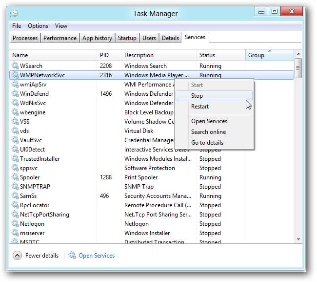 [サービスを開く]リンクをクリックして、タスクマネージャーにはない詳細オプションを含むサービスアプリケーションを使用できます。