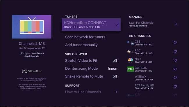 そこから、HDHomerunチューナーが、アンテナが取得したチャネルのリストとともに画面に表示されます。