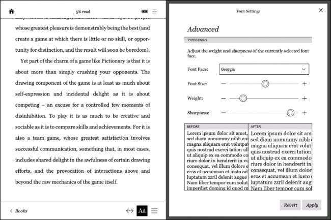 カスタマイズのカテゴリーでは、工房は本当にそれを釘付けにしました。 Aura HDには、ページの外観を微調整する方法がたくさんあります。失読症の読者を支援するために特別に設計された2つのフォントシステムであるDyslexieとOpenDyslexicを含む12以上のフォントから選択できます。フォントサイズ、行間隔、余白サイズを調整できます。これは、this-or-thatまたは1-2-or-3の選択プロセスだけでなく、スライダーを使用して段階的に調整することで調整できます。テキストの位置揃えを切り替えて調整することもできます。それでも調整が不十分な場合は、[詳細]フォントメニューにジャンプして、プレビューの前後に並べて表示する非常に便利なプレビューペインを使用して、フォントの太さとシャープネスを調整することもできます。