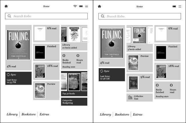 個々の要素(最後に読んだ本、最近完成した本、提案された本などの表示など)は嫌いではありませんでした。最近開いたもの(またはデバイスが最近更新したもの)に基づいて、タイルが移動しました。画面の周り。ある分、ライブラリタイルは上隅にあり、次は中央にあり、次に下にあります。それは方向感覚を失い、自動操縦でデバイスをナビゲートするのを妨げていました。上隅をタップするとライブラリが開き、下隅をタップすると読書統計ページが開くという感覚に慣れることはありません。