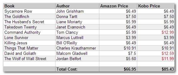 Aura HDのGUIでの経験と同様に、基盤となるKoboストアのエコシステムは、繰り返しになりますが、混合バッグでした。明確にするために、購入するものを見つけるのにそれほど問題はありません。アマゾンと工房の両方の店で何十冊ものベストセラーの本を探しましたが、手ぶらで出てくることはありませんでした。実際、中編小説や著名な作家の短編小説など、Amazonストア限定の商品を除いて、KoboにないものをAmazonで見つけることはできませんでした。いくつかの外れ値がある価格でさえ、リーズナブルでした。 2014年1月13日のニューヨークタイムズのベストセラーリストのフィクションとノンフィクションの本のトップ5は次のとおりです。