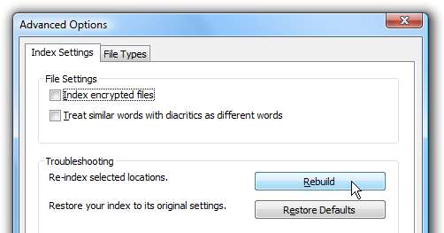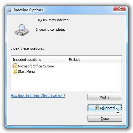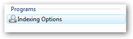 入力します インデックス作成 スタートメニューの検索ボックスに移動して、インデックスオプションを起動します。