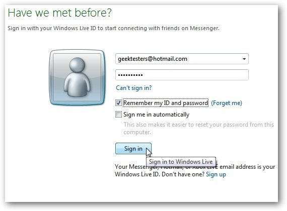 セットアップが完了したら、[スタート]メニューからメッセンジャーを起動します。サインイン画面がわずかに変更され、ウィンドウの下部に新しいセットアップの進行状況インジケーターが表示されます。標準のMessengerアカウントでサインインし、 自動的にサインイン メッセンジャーを起動するたびにメッセンジャーがこのアカウントを自動的に使用するようにする場合。