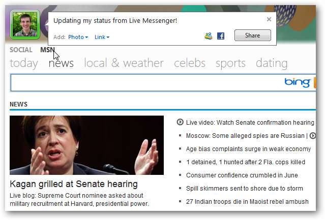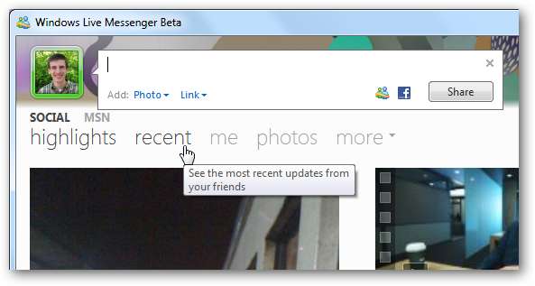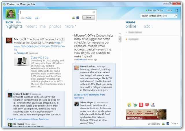 Facebook、Windows Live、およびその他のネットワーク上の友達やファンページからの更新は、メッセンジャーに直接表示されます。更新にコメントしたり、友達がメッセンジャーで直接共有したYouTubeビデオを表示したりすることもできます。