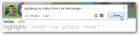 新しいアップデートを入力してを押します シェア Facebook、Windows Live、およびその他の接続されたネットワークでステータスを更新します。