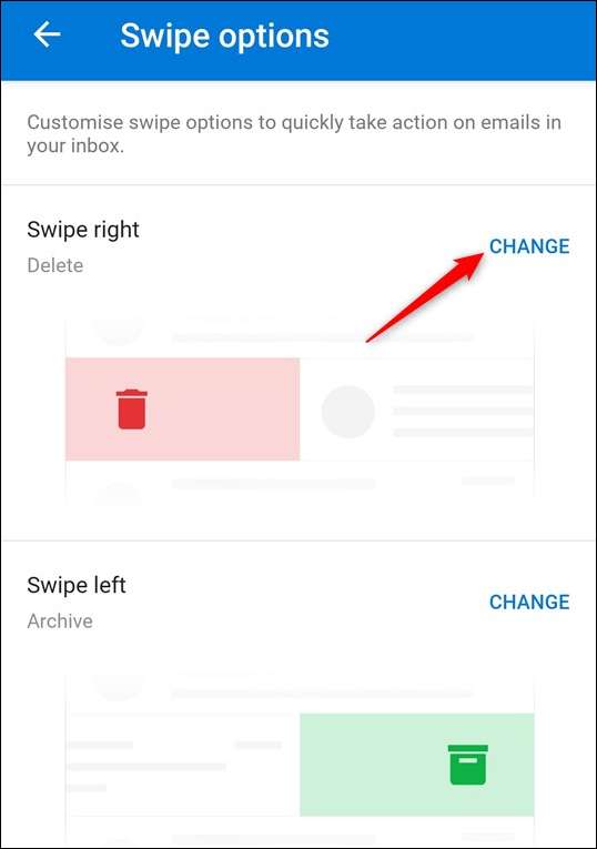 これにより、現在のスワイプアクションが表示されます。右側にある大きな[変更]オプションをタップして、[右にスワイプ]アクションを変更します。