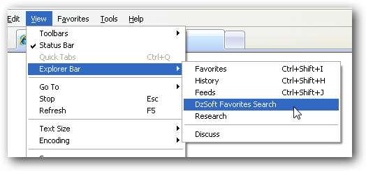 メニューが表示されるまでAltキーを押したまま、[表示]、[エクスプローラーバー]、[DzSoftお気に入り検索]に移動してこのバーにアクセスすることもできますが、これをオンにするのは便利な方法ではないため、ボタンを使用することをお勧めします。