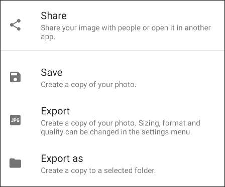 写真を編集したら、それを「エクスポート」する時が来ました。もう一度Snapseedはここに選択が簡単になります。あなたはあなたがする必要があるのであれば、あなたは別のアプリを使わなくても写真を直接共有することができます。あるいは、コピーを作成し、それを保存する特定のフォルダを選択することもできます。