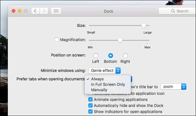 3つのオプションがあります。 「常に」は、アプリケーションにタブの使用を強制します。 「フルスクリーンのみ」では、フルスクリーンウィンドウを使用しているときに、アプリケーションでタブを使用するように強制されます。それでも「手動」ではタブを使用しません。つまり、「ウィンドウ」をクリックしてから「すべてのウィンドウをマージ」をクリックすることによってのみタブを使用できます。