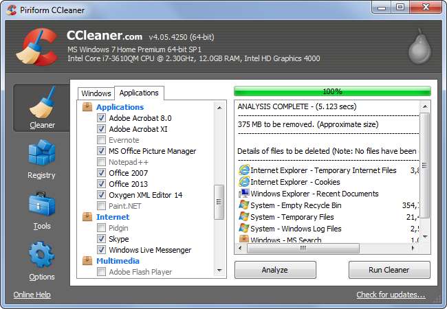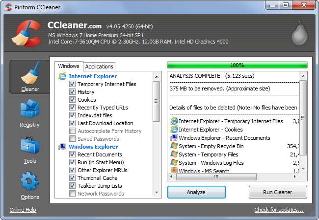 これらはすべてカスタマイズ可能ですが、CCleanerはデフォルトでこのデータを消去するように設定されています。 CCleanerは、役に立たない一時ファイルをすばやく消去するだけでなく、閲覧データだけでなく、コンピュータ全体の「履歴の削除」機能のようなものです。もちろん、CCleanerはあなたが使用する可能性のあるすべてのプログラムを知っているわけではないので、これが完璧になることは決してありません。
