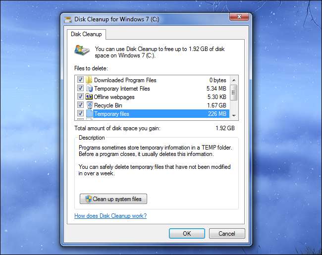 ある意味、Windowsの組み込みのようなものです ディスククリーンアップツール 、プログラムによって作成された古い一時ファイル、Internet Explorer用の一時インターネットファイル、Windowsエラー報告ログなどの不要なファイルを削除することで、ハードドライブの空き容量を増やします。このツールはいつでも実行して、ディスク領域を解放できます。