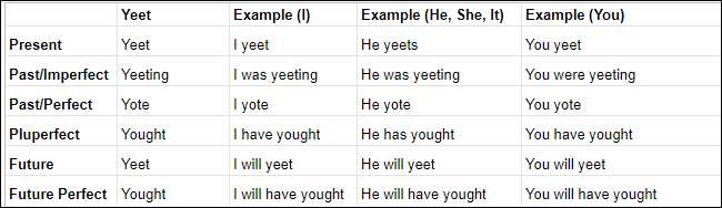 yeetの動詞の時制を研究することで、物事をさらに一歩進めることができます。この記事には、便利なYeet活用チャートが含まれています。このグラフを教育リソースとして自由に共有してください。ただし、yeetはによって単語として認識されないことに注意してください。 ウェブスター辞書 まだ。その定義は時間の経過とともに変化する可能性があり、教育者は1世紀かけて「すべてではない」または「すべて」に眉をひそめるのと同じように、この言葉に眉をひそめる可能性があります。