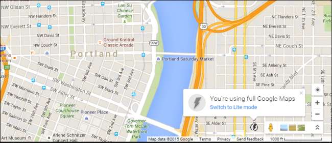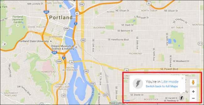 メインのマップレイアウトへの変更は、ブラウザウィンドウの右下隅にあり、稲妻アイコンで強調表示されています。 Liteモードをオンまたはオフにするには、このスイッチを切り替えるだけで、プロセスが成功したかどうかを確認するプロンプトが表示されます。