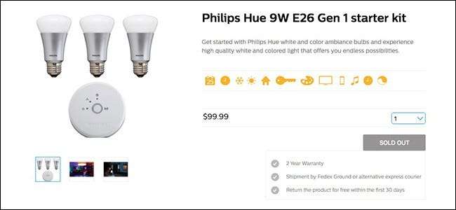 実際、これが、第1世代のPhilipsHue製品が現在も人気を博している大きな理由である可能性があります。通常、第1世代のスタートキットが販売されていますが、最近では フィリップスはそれをわずか99ドルに割引しました (売り切れと記載されていますが)これにより、第1世代のHueBridgeと3つの第1世代のカラーバルブが手に入ります。これは、第2世代のスターターキットの半分の価格です。