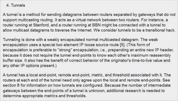 上記では「トンネルは過渡的なハックだと考えています」と述べていますが、トンネルは今日でも本質的に同じ意味で使用されています。トンネルを介して送信されるデータはカプセル化されているため、他の方法では送信をサポートしないプロトコルを介して送信できます。