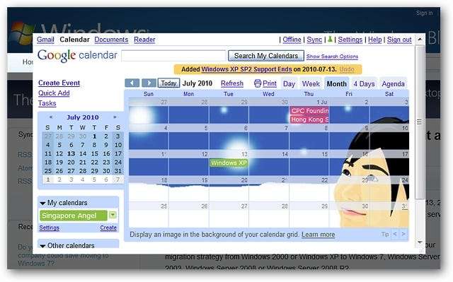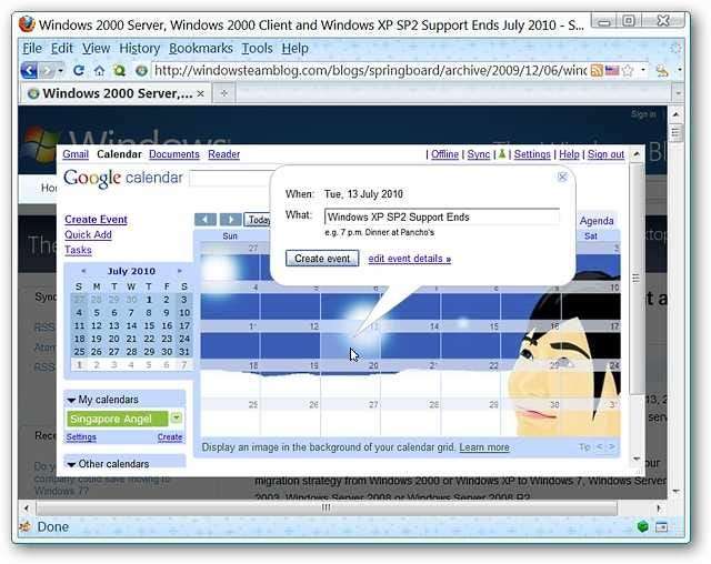 이 예에서는 Windows XP 서비스 팩 2에 대한 정확한 지원 마감 날짜를 제공하는 기사를보고있었습니다. 내년에 확실히 염두에 두어야 할 사항입니다. 보시다시피 캘린더가 현재 웹 페이지 위에 매우 멋지게 팝업되어 새 이벤트를 추가 할 수 있습니다. "음영 테두리"를 사용하면 배경에있는 사물 (예 : 깜박이는 광고) 대신 캘린더에 집중할 수 있습니다.