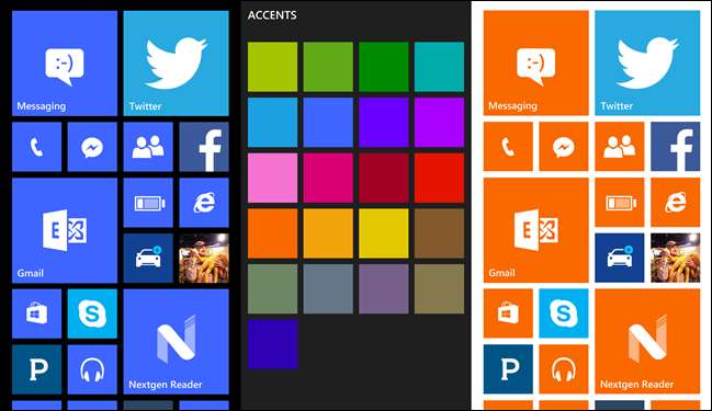 Windows Phone 및 Android는 원격으로 비슷하게 보이지 않았지만 자료 및 메트로 UI는 중요한 기능을 공유합니다. Windows Phone을 사용하면 가볍거나 어두운 테마를 선택할 수 있었고 2 차 "악센트"색상을 선택할 수있었습니다.