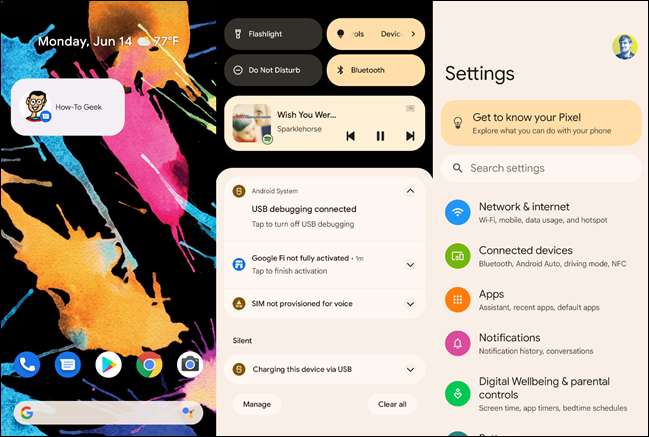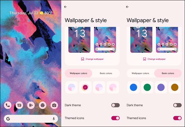 Android 12는 재료와 비슷한 것을 시도하고 있습니다. 수동으로 악센트 색을 선택하기보다는 바탕 화면에서 파생됩니다. 다른 색상 팔레트를 선택하여 색상을 약간 변경할 수 있지만 특정 색상을 선택할 수 없습니다. 테마의 배경 화면을 사용하지 않으려면 네 가지 색상 선택 만 사용할 수 있습니다.