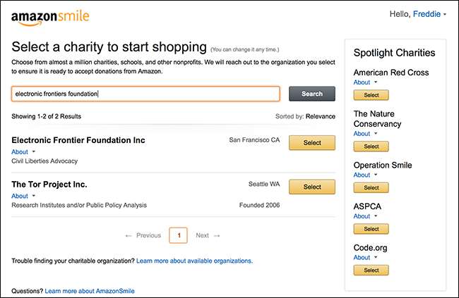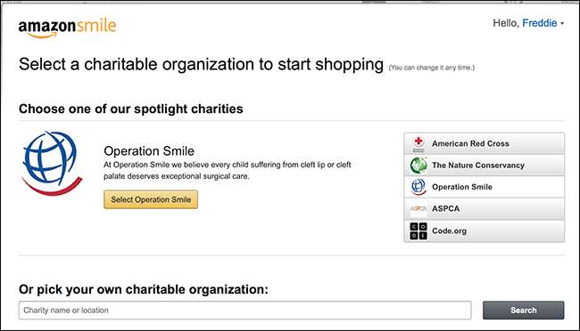 Amazon에는 홍보중인 5 개의 "Spotlight Charities"가 있지만 검색 상자를 사용하여 지원할 다른 하나를 찾을 수 있습니다. 대부분의 주요 미국 자선 단체를 이용할 수 있습니다.