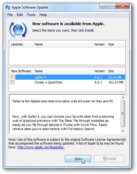 또한 컴퓨터에 다른 Apple 제품이없는 경우 필요하지 않은 Apple 소프트웨어 업데이트 도구를 설치합니다. 업데이트 도구에 대해 언급 할 가치가있는 또 다른 성가심은 기본적으로 "iTunes + QuickTime"이 선택되어 있으므로 업데이트를 실행하면 원하지 않는 경우에도 iTunes를받을 수 있다는 것입니다.