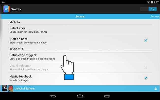 선택할 수있는 열려있는 앱 목록을 드래그하는 데 사용할 가장자리를 선택할 수 있습니다. 이렇게하려면 스위처 일반 설정 화면에서 Edge Swipe 아래에있는 Setup edge triggers를 터치합니다.