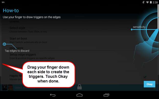 참고 : 에지 트리거 설정에 대한 팁이있는 팁 대화 상자가 표시 될 수 있습니다. 먼저 에지 트리거를 설정 한 다음 확인 표시를 터치하여 변경 사항을 적용하고 대화 상자를 닫은 다음 설정 화면으로 돌아갑니다.