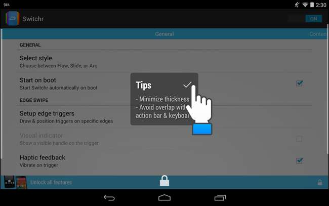 액션 바 때문에 화면 상단에 엣지 트리거를 넣을 수없고, 스위처 프로 버전 ($ 1.99)을 구매 한 경우에만 화면 하단에 엣지 트리거를 넣을 수 있습니다.