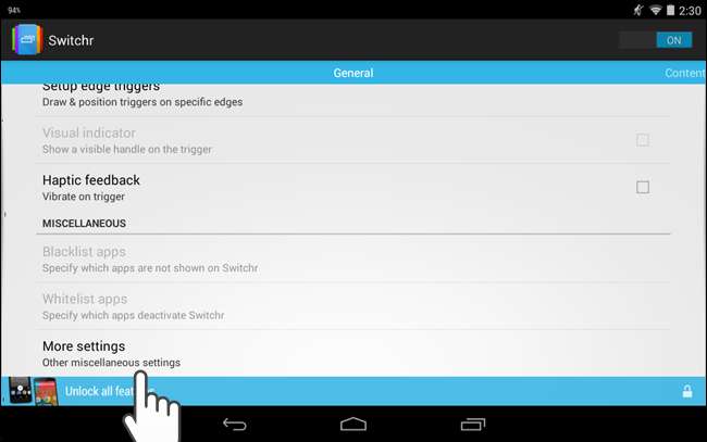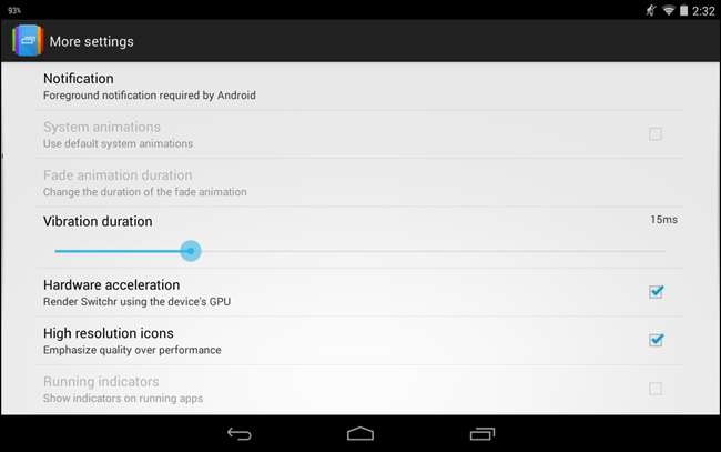 앱을 전환하기 위해 트리거에 액세스 할 때 기기가 진동하도록 선택할 수도 있습니다. 이렇게하려면 햅틱 피드백 확인란을 선택합니다. 추가 설정을 터치하면 추가 설정을 사용할 수 있습니다.