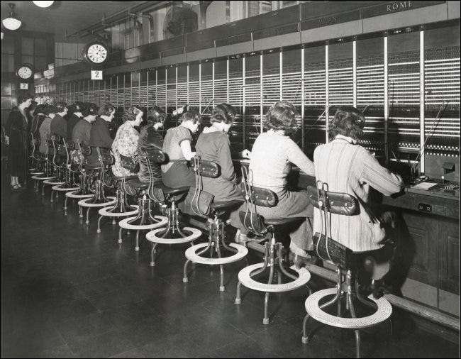 전 세계 전화 시스템이 컴퓨터 화되기 전에 전화는 인간 운영자 군대에 의해 물리적 스위치 네트워크를 통해 라우팅되었습니다. 전통적으로 이러한 운영자는 거의 독점적으로 여성이었습니다 (초기에는 십대 소년 거친 언어와 비전문적 인 행동으로 유명한 사람).
