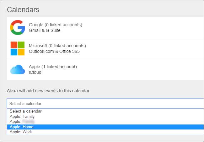 그런 다음 설정> 캘린더를 클릭하여 이전 캘린더 메뉴로 돌아갑니다. 여기에서 최종 선택을해야합니다. "Alexa가이 캘린더에 새 이벤트를 추가합니다."아래의 드롭 다운 메뉴에서 Alexa가 이벤트를 추가하는 모든 명령에 대해 기본적으로 사용할 iCloud 캘린더를 선택합니다.