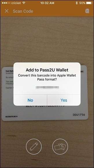 카드의 바코드를 스캔 할 수 있도록 앱에 휴대 전화 카메라 액세스 권한을 부여해야합니다. 거기에서 바코드를 카메라의 시야 내에 놓기 만하면 자동으로 스캔됩니다. 팝업이 나타나면 "예"를 누르고 바코드 번호를 확인합니다.