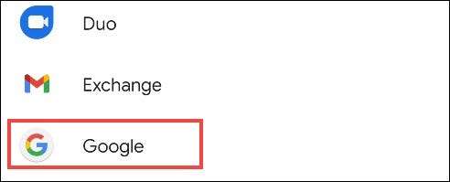 여기서는 계정을 추가 할 수있는 장치의 모든 앱을 볼 수 있습니다. 우리가 원하는 것은 "Google"입니다.