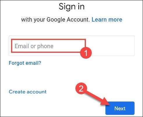 그런 다음 텍스트 상자에 Google 계정 이메일 주소 또는 전화 번호를 입력하고 "다음"을 누릅니다. "계정 만들기"를 선택 하여이 화면에서 계정을 만들 수도 있습니다.