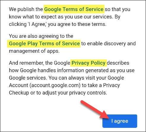 이제 Google 서비스 약관, Google Play 서비스 약관 및 Google 개인 정보 보호 정책에 대한 정보가 표시됩니다. 링크를 클릭하여 더 많은 링크를 클릭하십시오. 계속할 준비가되면 "동의 함"을 누릅니다.