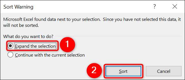 "정렬 경고"창이 열립니다. 이 창에서는 Excel이 다른 열에서 데이터를 조정하여 데이터가 그대로 유지되도록 허용합니다. "선택 항목 확장"옵션을 사용하고 "정렬"을 클릭하십시오.