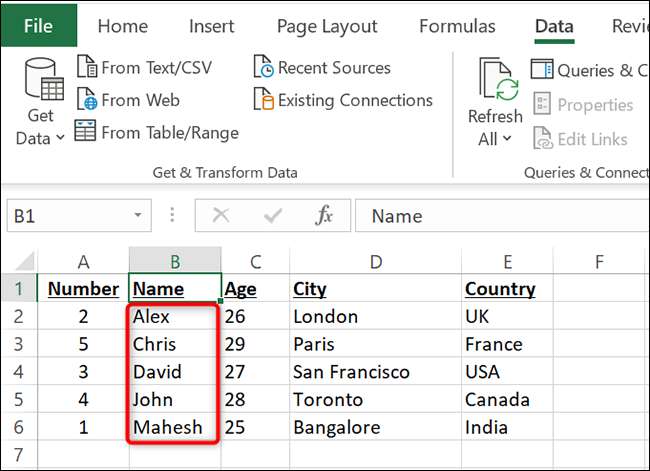 즉시 Excel은 스프레드 시트에서 선택한 데이터를 알파벳순으로 표시합니다.
