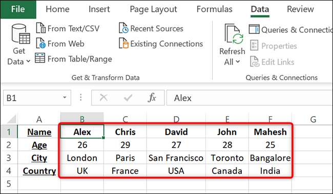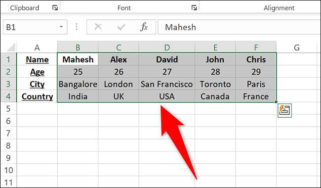[삼] Excel의 행에서 데이터를 알파벳순으로 추가 옵션을 구성해야합니다. [삼] 이렇게하려면 먼저 Microsoft Excel로 스프레드 시트를 시작하십시오. [삼] 스프레드 시트에서 데이터를 알파벳순으로 알려주는 전체 테이블을 선택하십시오. 테이블 헤더를 선택하지 마십시오. 다음 스프레드 시트에서 우리는 테이블 헤더 인 "도시", "시대", "도시"및 "국가"를 선택하지 않습니다. [삼]