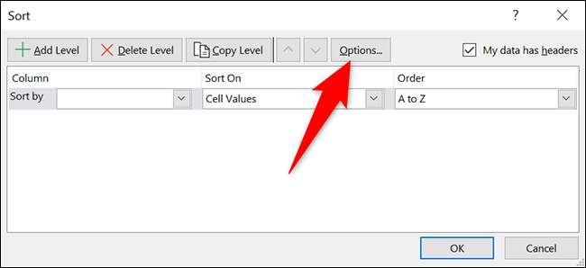 열 때 "정렬"창에서 "옵션"을 클릭하십시오.
