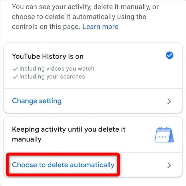 이제 YouTube 기록 페이지에 있어야합니다. 이전에 본 YouTube 동영상 목록 바로 위에있는 "자동 삭제 선택"을 탭하십시오.