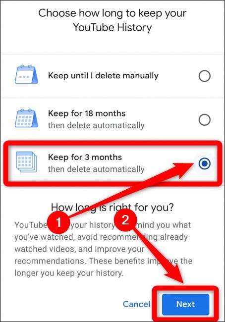 이제 YouTube 기록을 보관할 기간을 선택하세요. 기본적으로 기록은 수동으로 삭제할 때만 삭제됩니다. YouTube에서 18 개월 또는 3 개월이 지난 기록을 자동으로 삭제하도록이 설정을 변경할 수 있습니다.