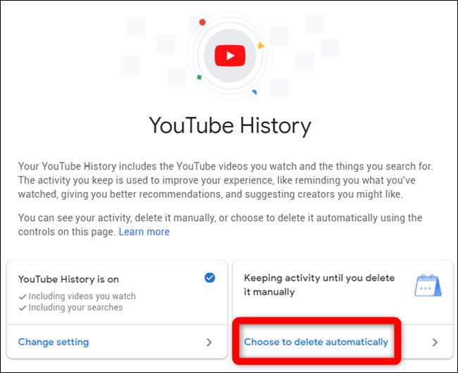 YouTube 기록 웹 사이트에서 기록 데이터가 삭제되는 빈도를 표시하는 상자에있는 "자동 삭제 선택"을 클릭합니다.