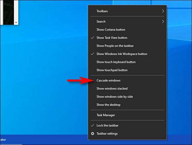 엉망을 통제하는 한 가지 방법은 창을 계단시키는 것입니다. 이렇게하려면 작업 표시 줄을 마우스 오른쪽 단추로 클릭하고 팝업 메뉴에서 "캐스케이드 창"을 선택하십시오.