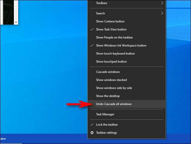캐스케이드를 실행 취소하려면 작업 표시 줄을 다시 마우스 오른쪽 단추로 클릭하고 메뉴에서 "Cascade All Windows 실행 취소"를 선택하십시오.