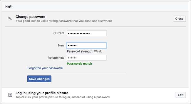 현재 비밀번호와 새 비밀번호를 두 번 입력합니다. 너무 짧거나 약하거나 확인이 일치하지 않으면 Facebook에서 알려줍니다.
