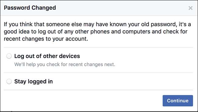 안전한 비밀번호가 있으면 변경 사항 저장을 클릭합니다. 다른 모든 기기에서 로그인 상태를 유지할 것인지 묻는 메시지가 표시됩니다. 계정이 해킹되었다고 생각되면 다른 장치에서 로그 아웃을 선택합니다. 그렇지 않으면 로그인 상태 유지를 사용할 수 있습니다.