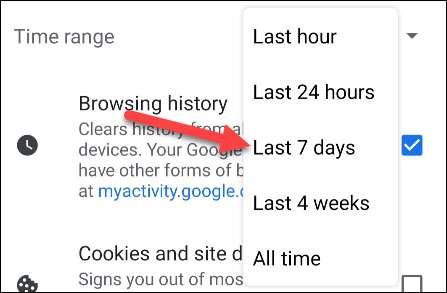 여기서 선택한 브라우징 데이터를 선택할 수있는 곳이 있습니다. 먼저 얼마나 멀리 얼마나 멀리 지우고 싶은지를 선택하십시오.